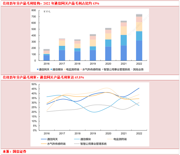 网络层产品贡献主要收入与利润,其中通信网关在具体产品中份额最高。网络层产品主要包括通信网关和通信模块,两项产品合计收入占比由2016年的53.6%提升至2022年的62.1%;毛利润层面,两项产品合计毛利润占比由2016年的57.6%提升至2022年的62.8%,其中2022年通信网关产品毛利润占比43.0%份额最高。