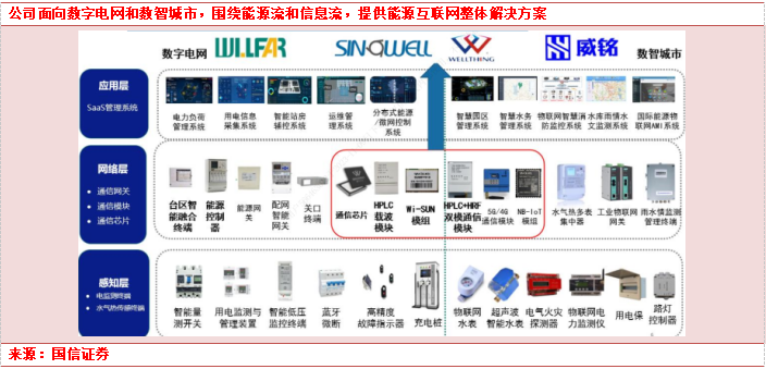 威胜信息(688100.SH)2004年成立,是中国最早专业从事能源互联网的企业之一,为“数字电网+数智城市”领域提供物联网综合应用解决方案,主要产品贯穿物联网感知层(电监测终端、水气热传感终端)、网络层(通信网关、通信模块)与应用层(电力负荷管理系统/智慧园区管理系统等),获得国家电网等知名客户的广泛认可。