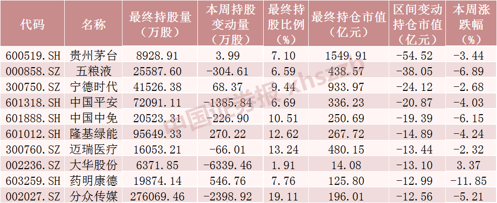 本周北向资金持仓市值减少额前十个股