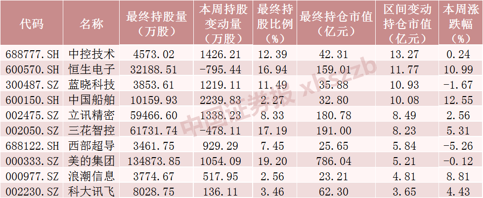本周北向资金持仓市值增加额前十的股票中,除恒生电子、三花智控分别被减仓795.44万股、478.11万股外,其他股票均被加仓,其中对中控技术、蓝晓科技、中国船舶、立讯精密、美的集团的持股增加数超1000万股。
