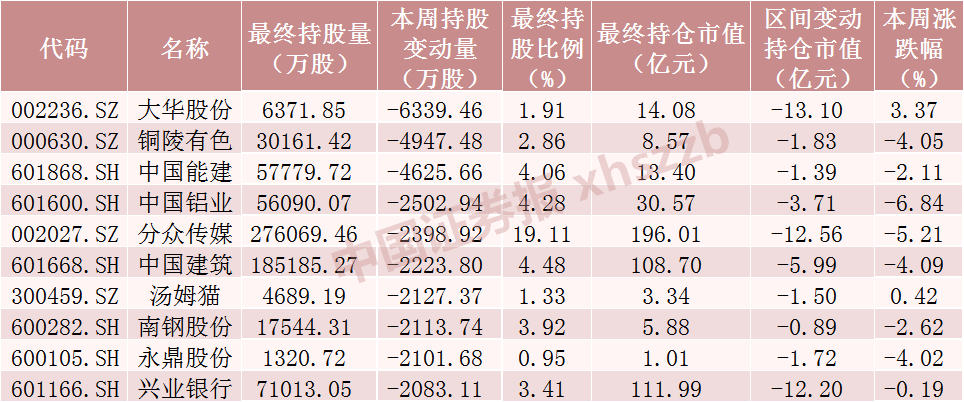 本周北向资金减仓股数前十个股