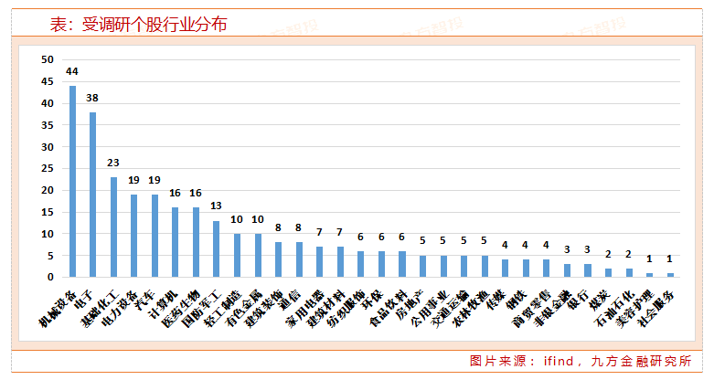 从行业分布来看,本期机械设备行业调研量跃居首位,有44家上市公司接受调研;随后电子行业,有38家上市公司接受调研。