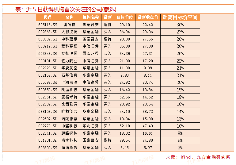 最新机构首次关注股票方面,近5日共有44份研报对上市公司进行首次覆盖。其中,18家获得明确的目标价格。