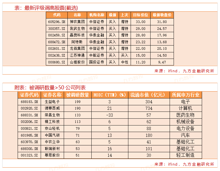 近5日有23家公司获得券商调高评级,神农集团、我武生物、晶澳科技、阿特斯、龙佰集团、江苏神通、山推股份等获券商给出明确目标价格。