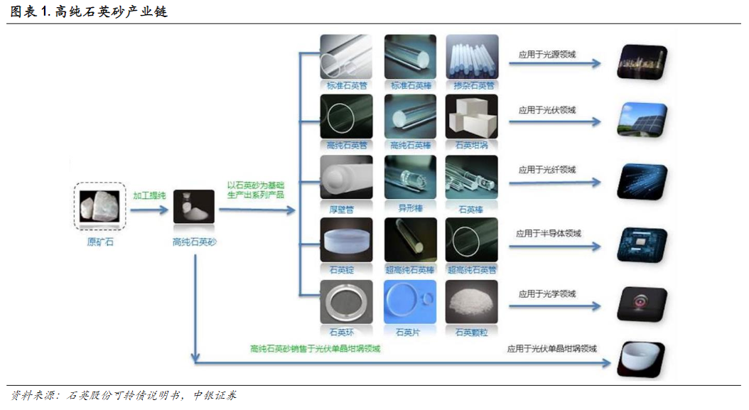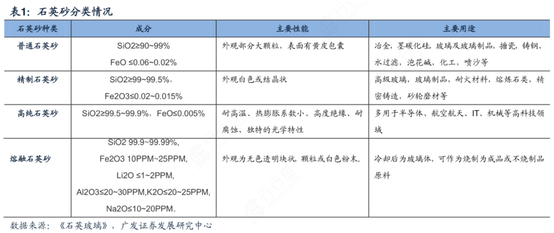 公开资料显示,石英是一种天然矿物,需要经粉碎、筛选、酸洗、水洗、煅烧等工序制成石英砂,工业上石英砂一般可分为普通石英砂、精制石英砂、高纯石英砂、熔融石英砂等。其中高纯石英砂具有耐高温、热膨胀系数小、高度绝缘、耐腐蚀以及独特的光学特性,应用在半导体、光通讯、电光源、航空航天、IT、新能源等高端产业。