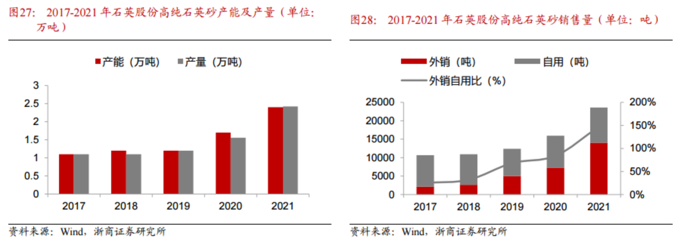 石英股份作为全球第三家、国内首家掌握规模化高纯石英砂量产技术的企业,公司的高纯石英砂产量产能保持连续同步上涨趋势。2021年高纯石英砂产量为2.4万吨,同比增长55.8%,2022年名义扩产4万吨项目在6月完成满产,将推动公司进一步扩大市场份额。
