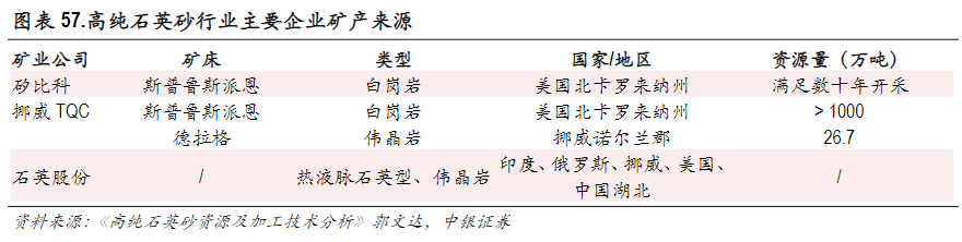 目前全球仅尤尼明、TQC、石英股份三家企业具备量产高纯石英砂的能力,国内其他有江苏阳山、东海几家小工厂、 辽宁锦州几家小厂、凯盛石英太湖公司等,但无法稳定批量供应。中信证券孙明新等研报中预计未来扩产增量主要以石英股份为主,行业中小企业存在小幅扩产行为,高纯砂行业CR3有望维持80%左右的高集中度。