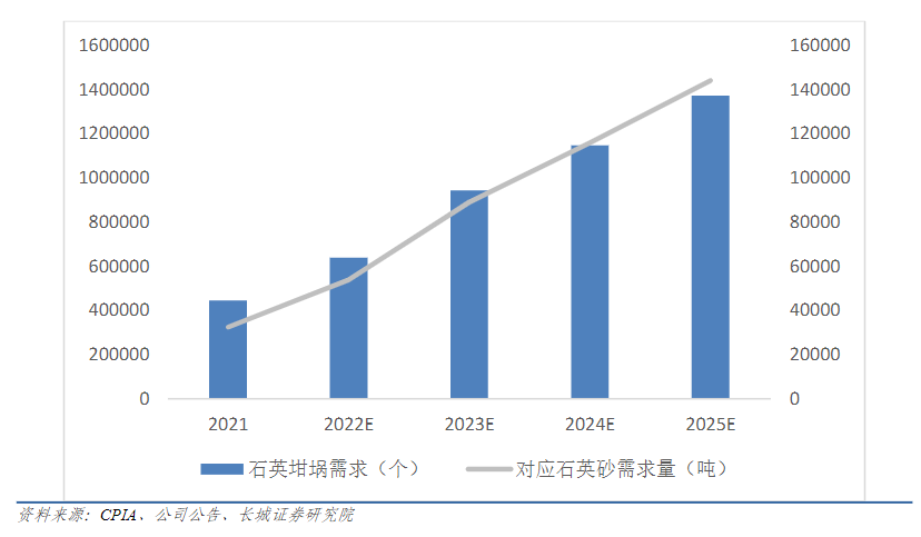 其中,石英坩埚为光伏级高纯石英砂的主要制品,用于制备硅片,是单晶硅生长炉的组成部分。长城证券于夕朦等在2约2日研报中表示,光伏放量预期下,需求火热持续,测算2022-2024年光伏单晶硅领域需求石英坩埚6.39、9.44、11.48万个。