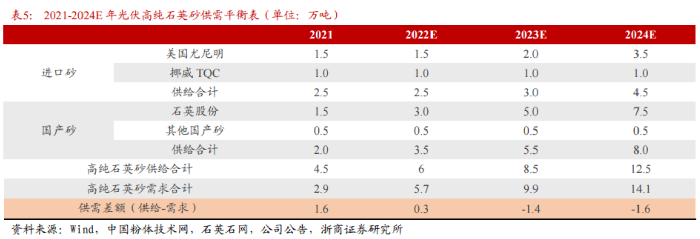 从供给端上看,2021年高纯石英砂供给合计为4.5万吨,张雷指出鉴于海外供应商暂无明确扩产计划,且扩产周期需要18个月,短期进口砂供给维稳。因此2022-2024年供应缺口将进一步拉大,预计供给与需求的差额分别为0.3万吨、-1.4万吨、-1.6万吨。