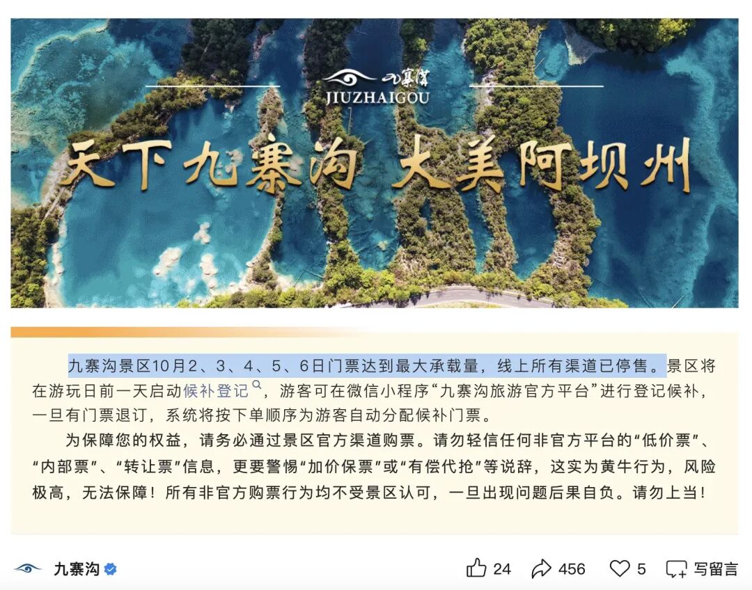 多景区门票售罄!九寨沟门票达到最大承载量 启动候补登记!