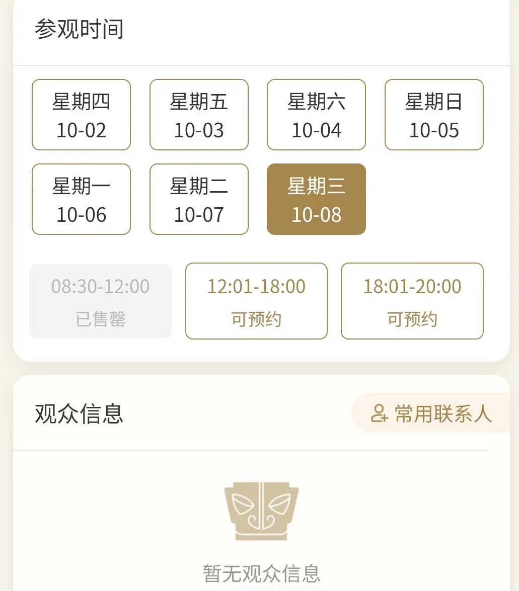 截至记者发稿时,成都周边多个景区、博物馆部分时段门票已约满、售罄,未预约勿前往。其中,三星堆博物馆10月1日-7日全时段票售罄,仅剩10月8日部分时段还有余票;熊猫谷景区10月2日至4日全天以及10月5日门票已售罄,10月6日下午门票即将售罄,其余场次尚有余票;四川科技馆10月2日-10月4日已约满,10月4日暂未开放预约;成都博物馆10月1日-10月6日已约满。