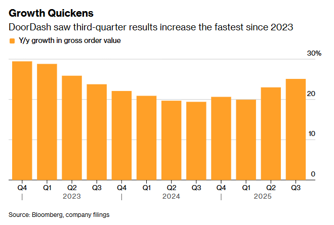 财报显示,在截至9月30日的三个月里,总订单价值增长25%,达到250亿美元,超过分析师平均预估的246亿美元。这一增长创下自2023年中期以来的最大涨幅,DoorDash将其归因于月活跃用户的“强劲增长”,目前,DoorDash通过旗下Wolt业务及近期收购的Deliveroo业务,已将业务拓展至全球40多个国家。营收同比增长27%至34.5亿美元,同样优于33.6亿美元的市场预期。