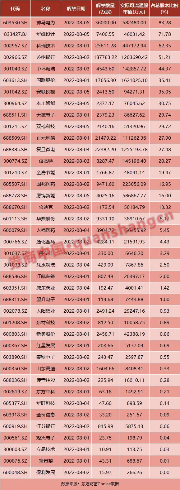 数据显示,本周(8月1日~8月5日)共有40家公司限售股陆续解禁,合计解禁量39.04亿股,按7月29日收盘价计算,解禁市值为715.83亿元。