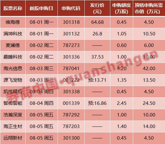本周共有11只新股发行。其中,周一2只:维海德、满坤科技;周二2只:麦澜德、趣睡科技;周三2只:海光信息、源飞宠物;周四2只:凯格精机、智微智能;周五3只:浩瀚深度、海正生材、远翔新材。