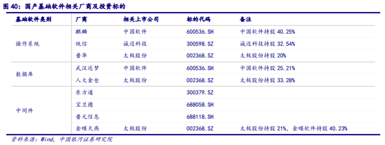具体到上市公司,操作系统方面,主要厂商有麒麟软件、统信软件、普华软件,分别对应持股上市公司标的为中国软件、诚迈科技、太极股份,从目前行业竞争格局来看,麒麟与统信处于较为领先位置。