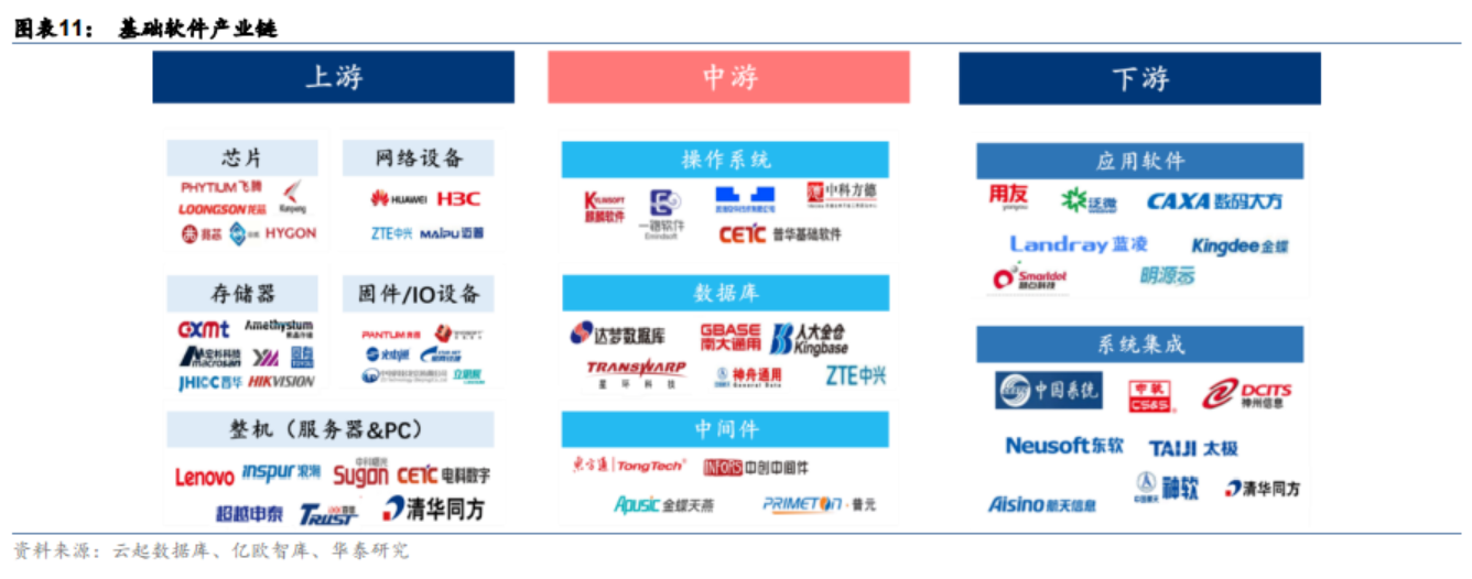 从产业链上看,基础软件上游主要是芯片、网络设备、存储器、固件/IO设备以及整机等基础硬件厂商,基础软件在计算机系统中作为接触硬件的第一层软件,需要根据基础硬件的架构、终端特点等进行开发。