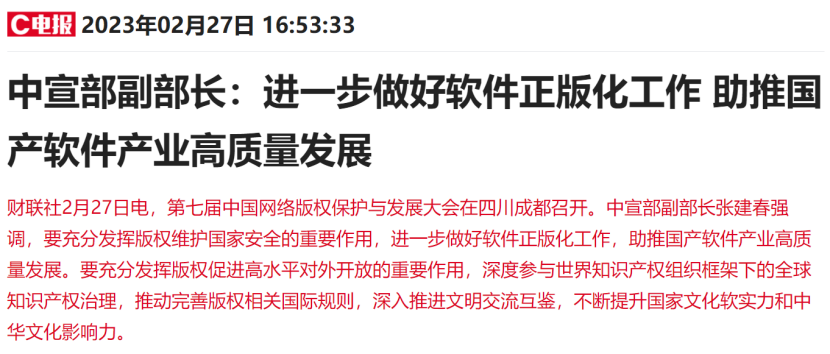 中宣部副部长张建春周一在第七届中国网络版权保护与发展大会上强调,进一步做好软件正版化工作,助推国产软件产业高质量发展。此外,据新华社报道,2月21日,中共中央政治局就加强基础研究进行第三次集体学习,强调要打好科技仪器设备、操作系统和基础软件国产化攻坚战,提升国产化替代水平和应用规模。