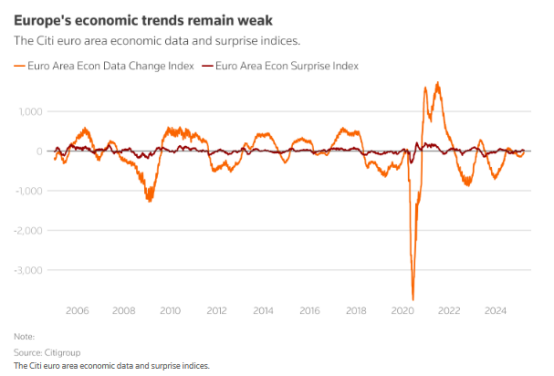 欧洲经济复苏刚现雏形:商业活动温和扩张,德国预计持续两年的衰退即将终结。花旗欧元区经济意外指数自2月初持续为正,但衡量数据是否高于一年均值的指标仍处负值区间,显示全面复苏尚未形成。