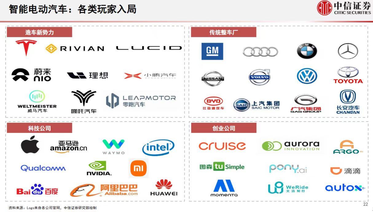 智能驾驶赛道聚集各类玩家,包括特斯拉、小鹏汽车、蔚来等造车新势力,比亚迪、上汽集团、广汽集团、长安汽车、东风汽车等传统整车厂,华为、百度、苹果、小米、阿里巴巴等科技公司,以及momenta、滴滴等创业公司。