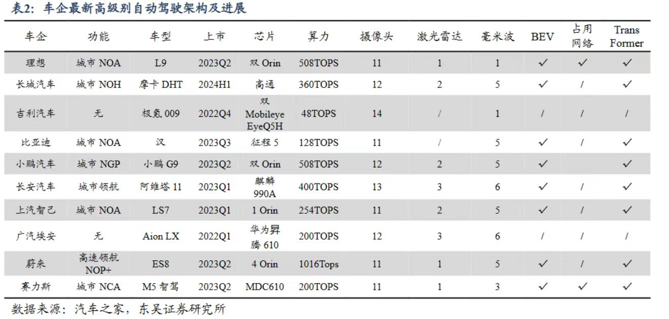 东吴证券研报梳理长城汽车、比亚迪、长安汽车和赛力斯等车企最高级别自动驾驶架构及进展,指出2023年H2以及2024年是车企智能化新车加速投放的窗口期,其中城市NOA(类L3级别自动驾驶)功能成为区分车企智能化的关键能力。