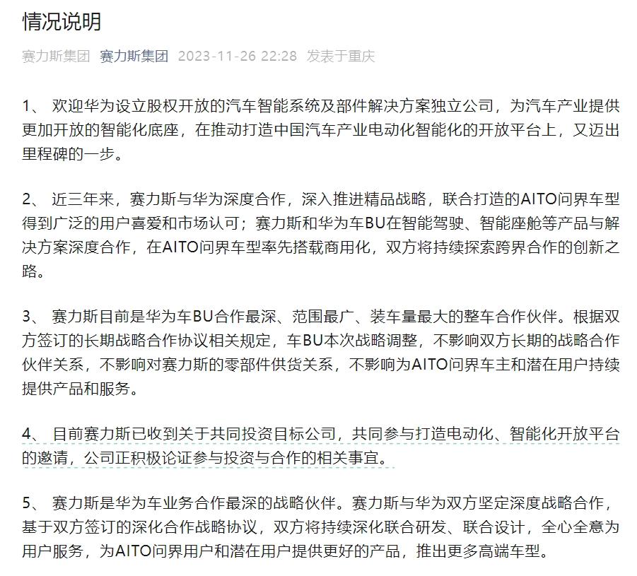 对于华为拟设立一家新公司,计划将智能汽车解决方案业务的核心技术和资源整合至新公司,并对现有战略合作伙伴车企及有战略价值的车企等投资者开放股权,赛力斯在11月26日深夜发布《情况说明》,称目前赛力斯已收到关于共同投资目标公司、共同参与打造电动化及智能化开放平台的邀请,公司正积极论证参与投资与合作的相关事宜。