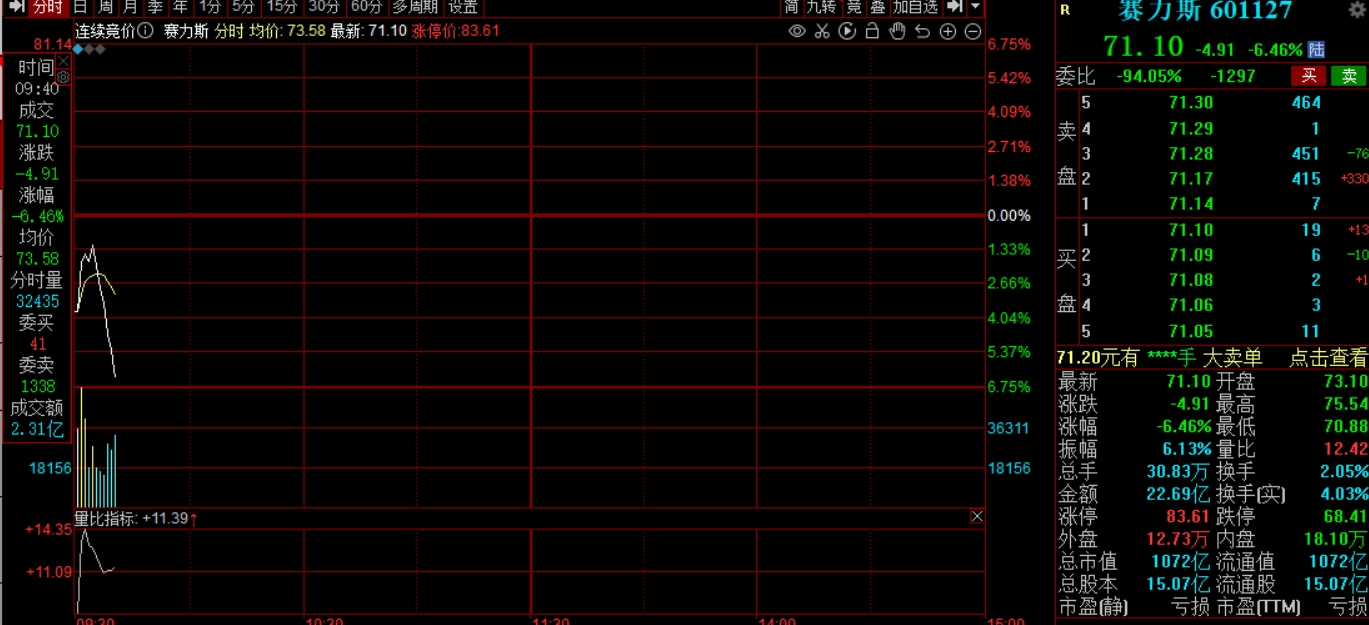 11月27日,赛力斯开盘跌3.83%,截至发稿,跌幅扩大至逾6%。