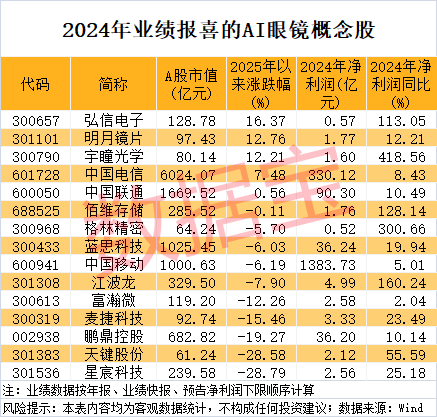 二级市场表现方面,据数据宝统计,截至4月23日收盘,上述15只业绩报喜的AI眼镜概念股中,今年以来仅5股上涨,分别是弘信电子、明月镜片、宇瞳光学、中国电信、中国联通。5股今年以来累计跌幅超10%,分别是富瀚微、麦捷科技、鹏鼎控股、天键股份、星宸科技。