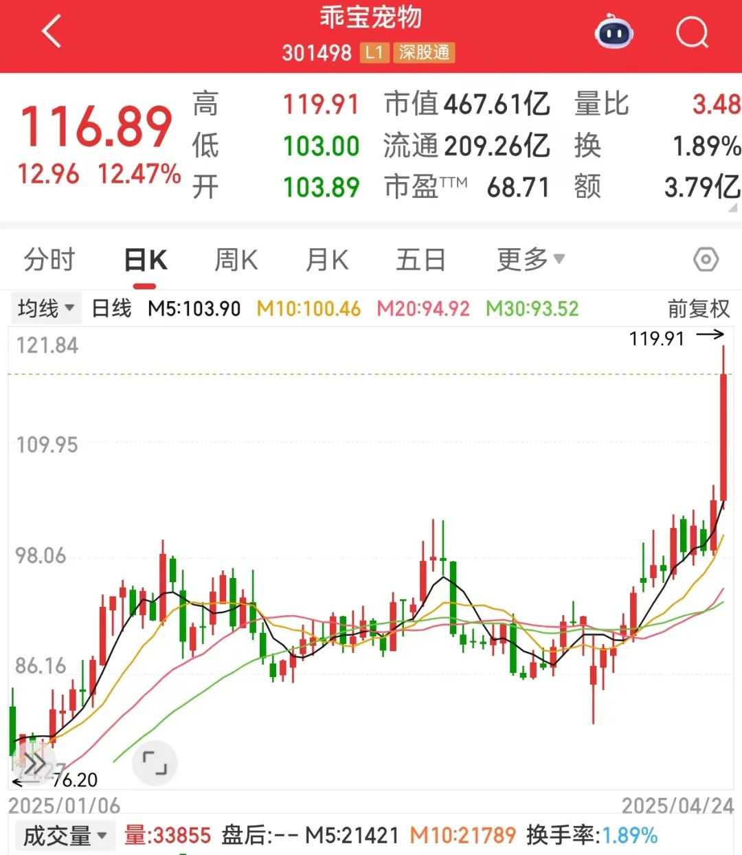 4月24日早盘,乖宝宠物低开高走,盘中一度涨超15%,股价逼近120元/股,创下历史新高。