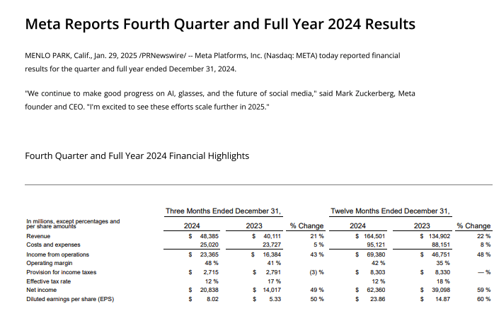 Meta Platforms2024年Q4营收483.85亿美元,市场预期470亿美元,上年同期401.11亿美元。2025年第一季度收入预计为395亿至418亿美元,区间中点低于市场预期的417.3亿美元。