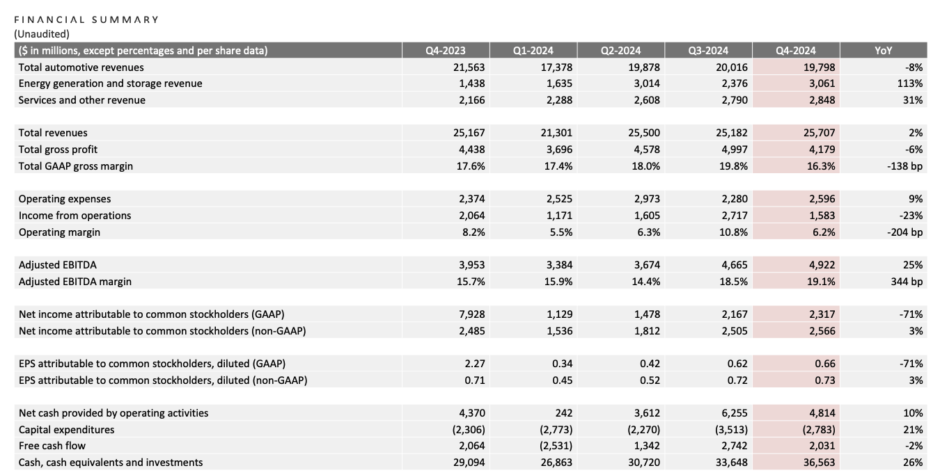 Q4汽车收入同比下降8%,至198亿美元,导致整体营收仅增长2%。净利润大幅下滑71%至23.2亿美元,营运利润率显著下降至6.2%。值得一提的是,特斯拉能源业务表现强劲,同比增长113%,达30.6亿美元。