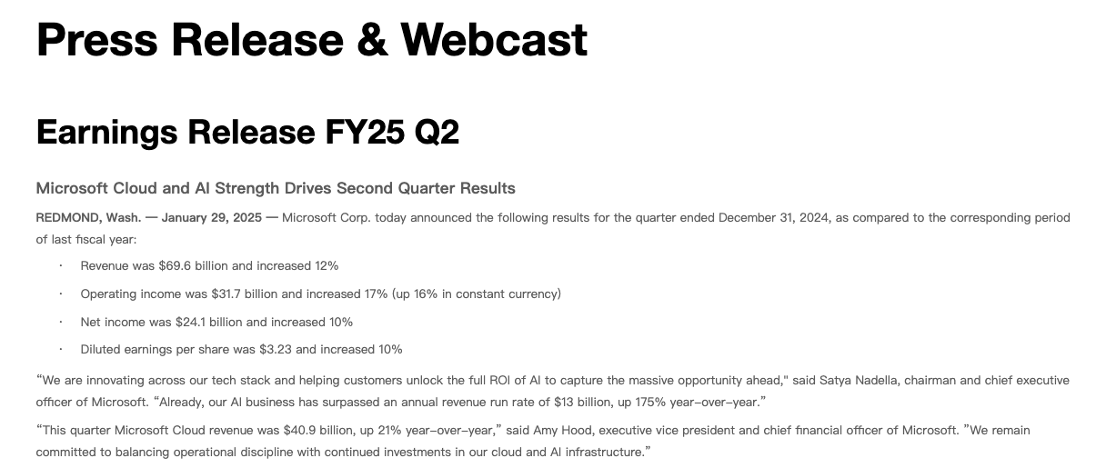 微软公布的2025财年第二季度财报显示,每股收益为3.23美元,超出预期的3.11美元,营收为696.3亿美元,同比增长12%,虽好于预期,但也是2023年中期以来最慢的增速。同时由于Azure云服务增长低于预期,公司股价在盘后交易中下跌超过5%。