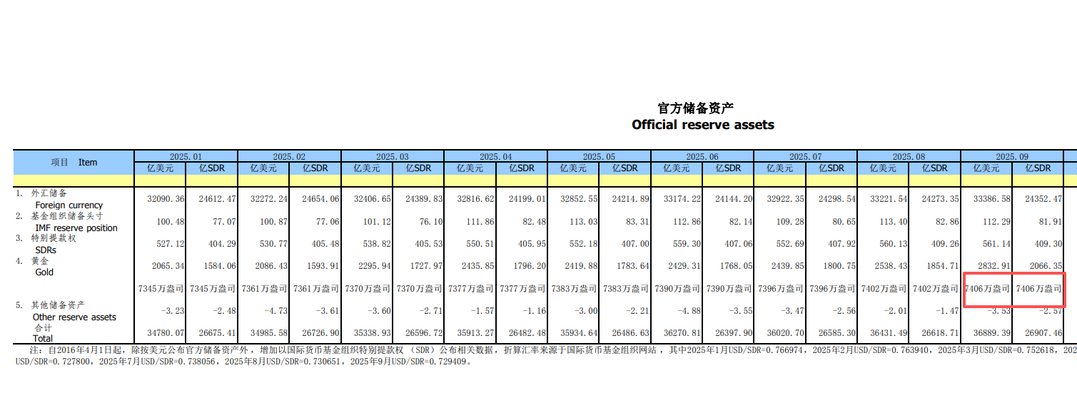 央行数据显示,中国9月末黄金储备7406万盎司(约2303.523吨),环比增加4万盎司(约1.24吨),为连续第11个月增持黄金。8月末黄金储备7402万盎司。