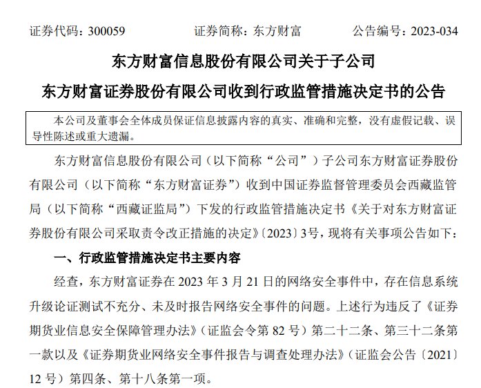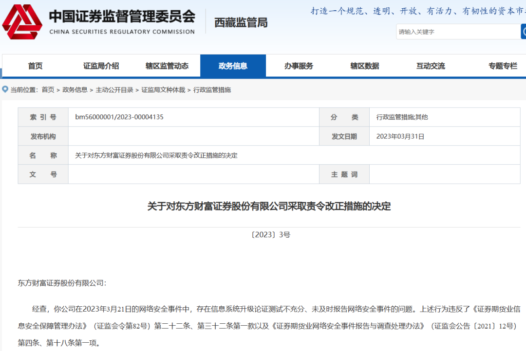 西藏证监局近日发布关于对东方财富证券股份有限公司采取责令改正措施的决定。经查,东方财富在2023年3月21日的网络安全事件中,存在信息系统升级论证测试不充分、未及时报告网络安全事件的问题。