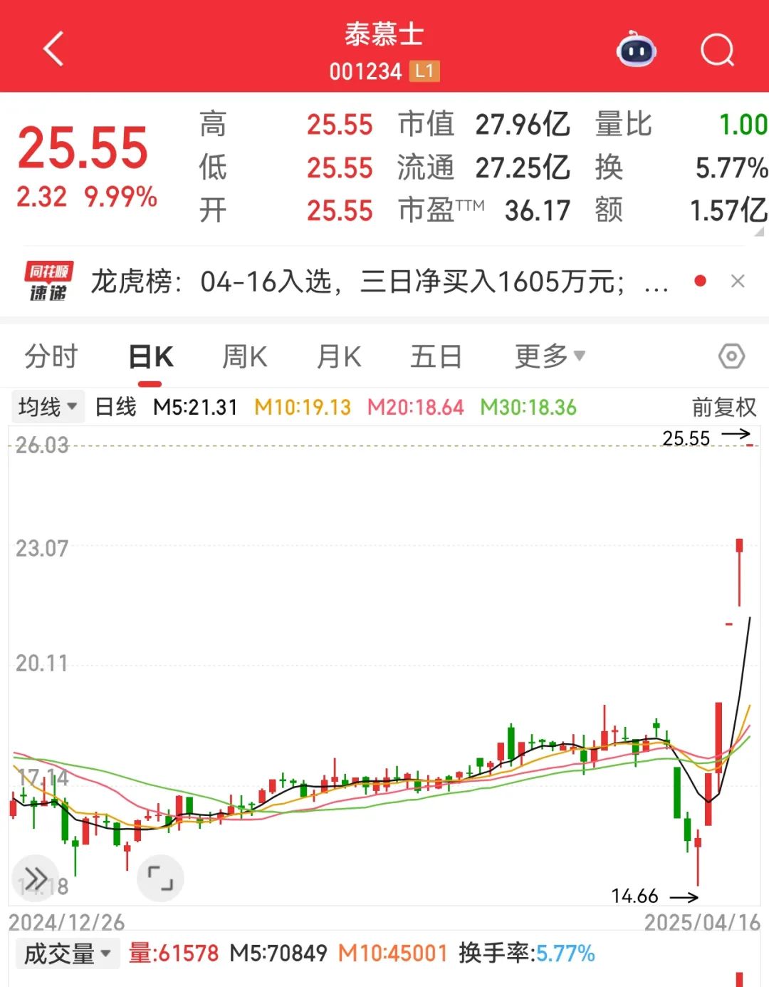 盘面上,目前连续涨停次数最多的是泰慕士,该股目前已录得连续5个涨停板,最新收盘价创近一年来新高。公司主营业务为针织面料和针织服装的研发、生产和销售,主要为迪卡侬、森马服饰、蕉内、Quiksilver、佐丹奴、 全棉时代、曼妮芬、安踏、波司登等知名服装品牌提供贴牌加工服务。
