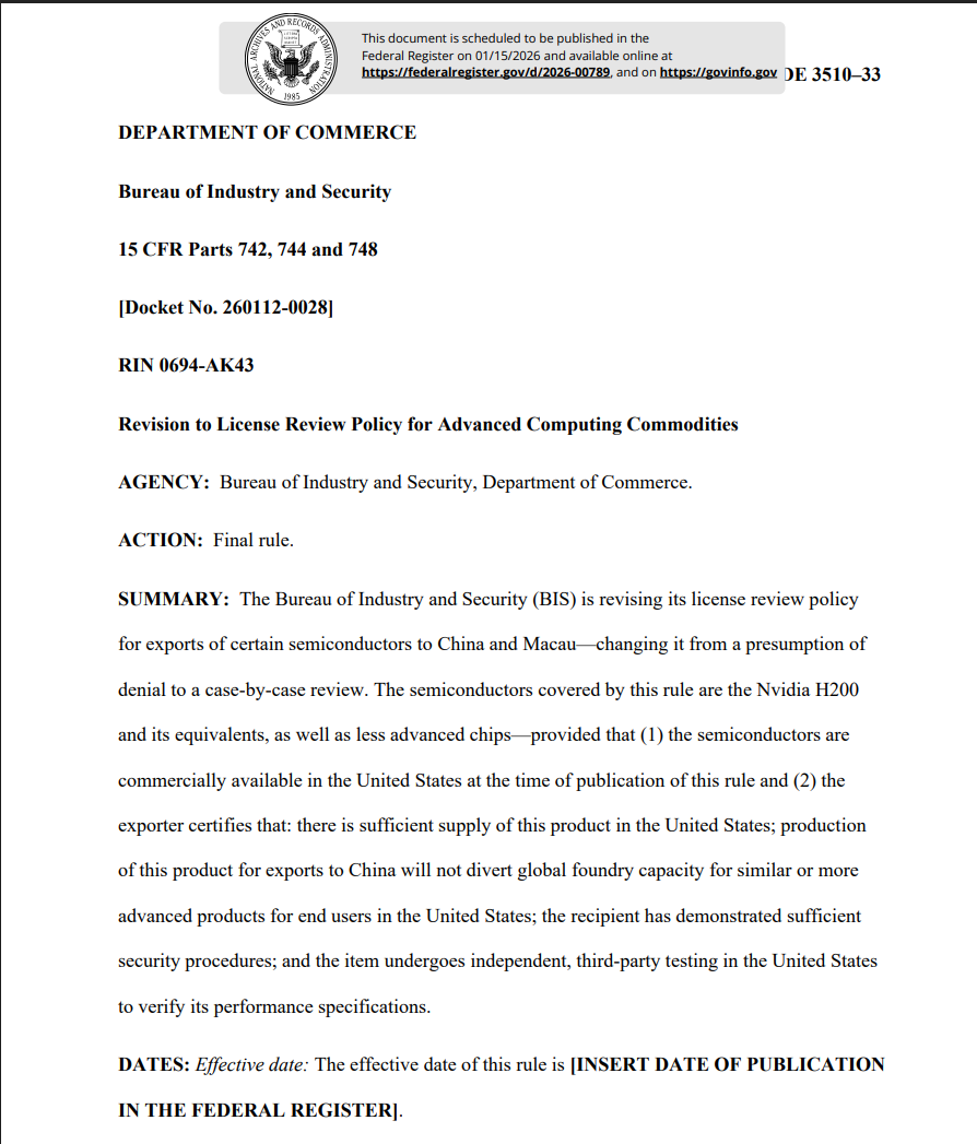 根据美国商务部周二发布的一项规定,美国商务部将对向中国出口人工智能芯片的申请进行“逐案审查(case-by-case review)”,相较于此前美国“默认拒绝(presumption of denial)”任何向中国客户销售此类芯片的请求的立场有所转变。
