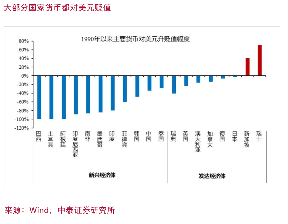 1990年以来,只有瑞士法郎和新加坡币对美元是升值的,全球货币的普遍超发和贬值,使得人们对纸币泛滥的担忧进一步加深,增加了人们对黄金这样天然具有货币属性资产配置比例的需求。因此,黄金上涨的长期逻辑应该是成立的。