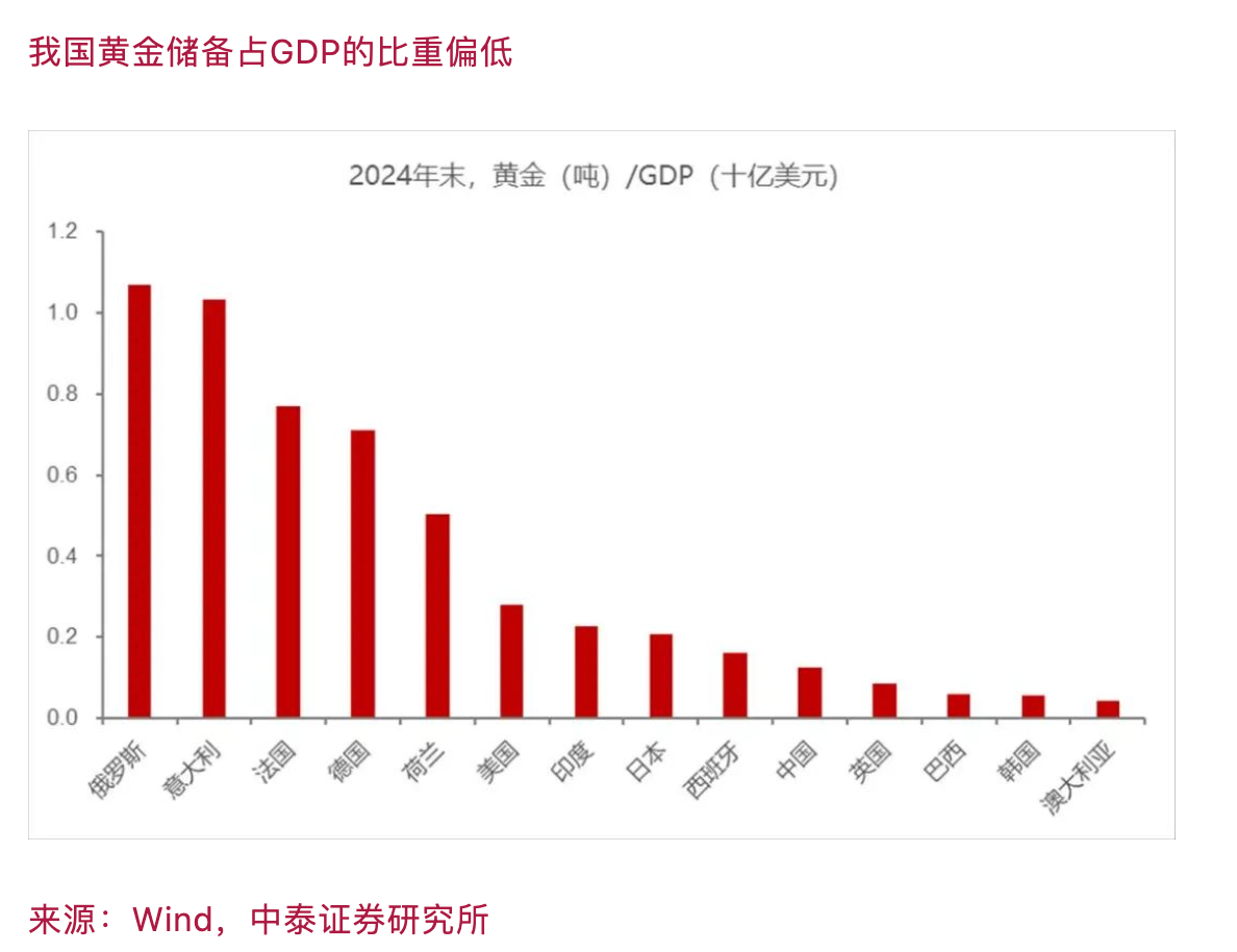 2024年全年,我国央行累计增持黄金44.17吨,推动黄金储备量从年初的2235.4吨上升至年底的2279.57吨。结合2024年和2025年一季度数据, 我国央行累计增持黄金总量约为56.93吨。尽管如此,我国的黄金储备与经济体量相比还是偏少。