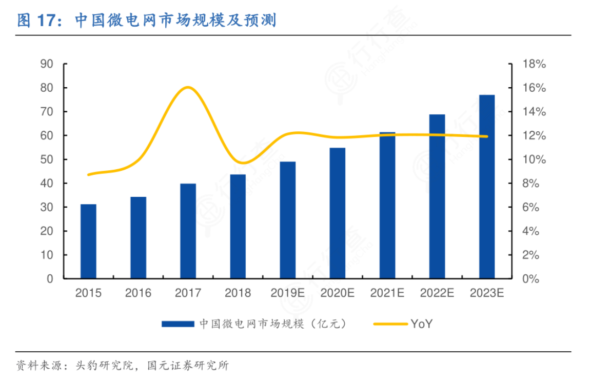国元证券耿军军研报中表示,现阶段,微电网的技术推广已从起步阶段步入快速发展阶段。根据头豹研究院的数据,2018年中国微电网市场规模达到43.7亿元,同比增长9.8%。随着国家行业扶持政策的推进、核心技术的进步与下游应用领域的拓展,预计中国微电网行业市场规模将会在2023年突破70亿元,市场潜力巨大。