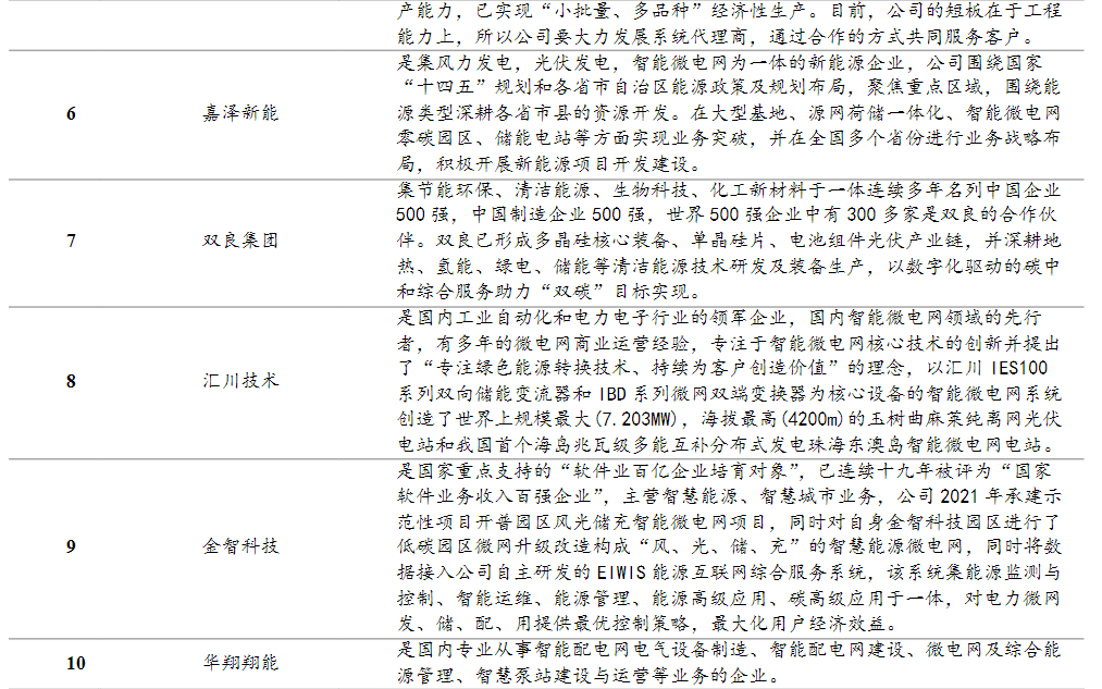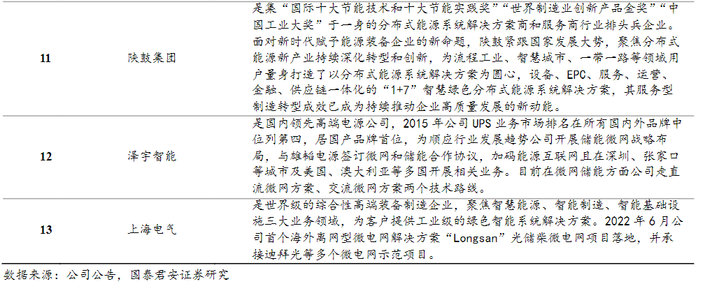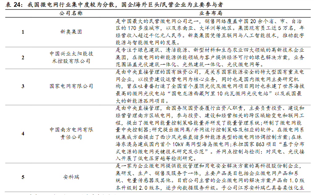 国泰君安韩其成研报中表示,由于我国微电网行业发展仍处于示范和试点阶段,因此行业集中度较为分散。从行业竞争格局看,主要分为三种类型的企业。第一类是国家队成员,主要服务于国网/主干网,客户资源丰富,具备较强的研发和资金实力,合同确定性强但议价能力弱,但此类企业数量较少;第二类是如施耐德等海外巨头公司,这一类公司发展起步早、产品综合技术能力强,具备较强的品牌价值和溢价能力,但产品服务成本及售价较高。