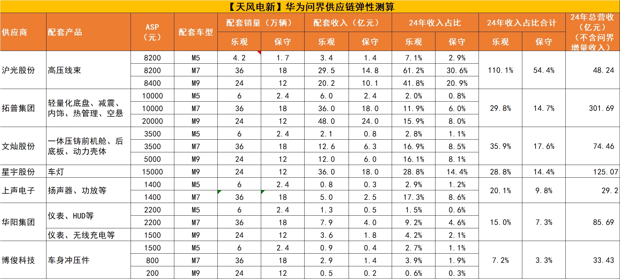 1)华为问界供应链弹性测算:(来源:天风电新)