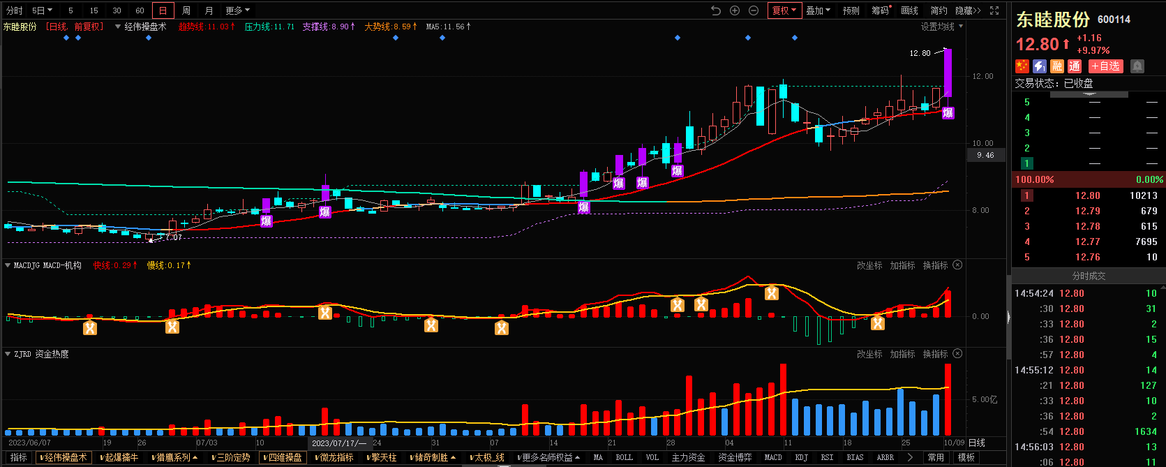 3)参考技术指标:东睦股份-经伟操盘术指标-出现爆点信号和红色线