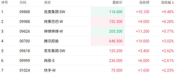受益于市场利好,港股科网股多数走强。截至发稿,百度集团-SW(09888.HK)涨9.48%、阿里巴巴-W(09988.HK)涨6.28%、京东集团-SW(09618.HK)涨2.62%、快手-W(01024.HK)涨2.25%。