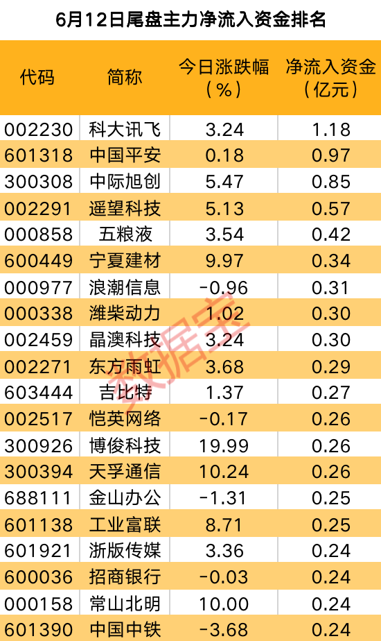从个股看,5股尾盘净流入资金超4000万元。科大讯飞尾盘主力资金抢筹1.18亿元居首,今日成交额居首。