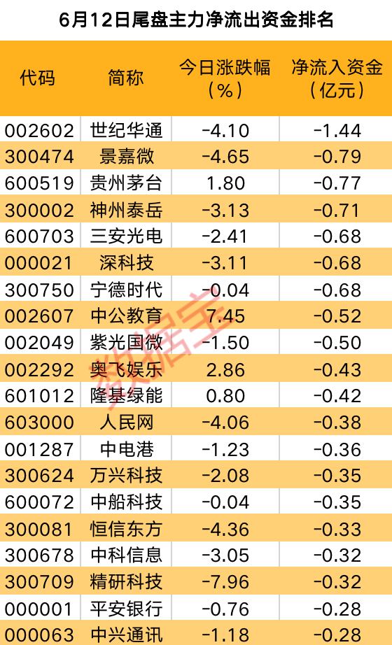 数据宝统计,世纪华通尾盘主力资金净卖出1.44亿元,居首位;其后景嘉微、贵州茅台和神州泰岳尾盘主力资金均出逃超0.7亿元。