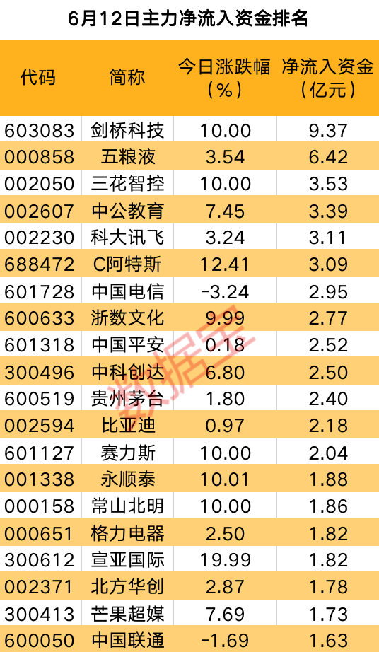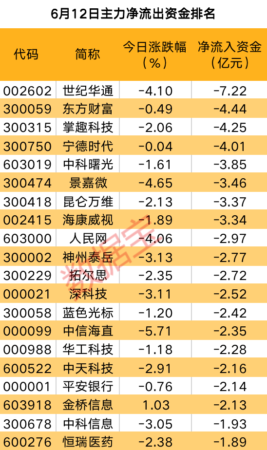 证券时报·数据宝统计,6月12日,沪深两市主力资金净流出133.2亿元,其中创业板净流出56.48亿元,沪深300成份股净流出12.87亿元。