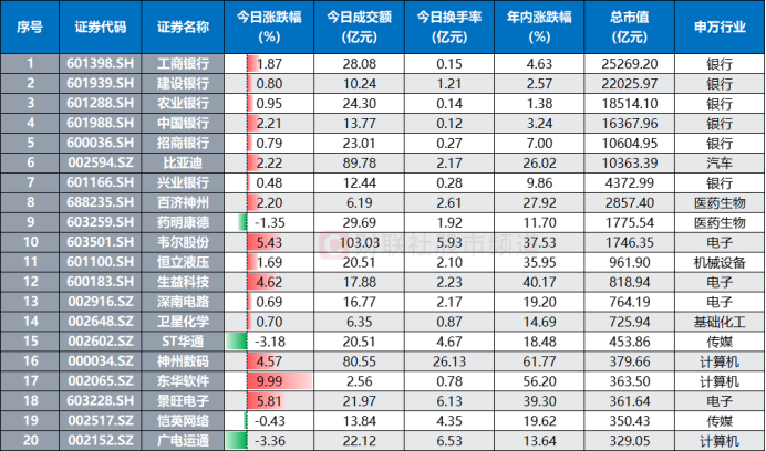 具体个股来看,今日股价创近1年新高的个股中,共有10只千亿权重股在列,其分别为工农中建四大行、招商银行、比亚迪、兴业银行、百济神州、药明康德、韦尔股份。其中,比亚迪、百济神州今日股价也双双录得历史新高,年内涨幅分别达26%、28%。此外,恒立液压、生益科技、深南电路、卫星化学、ST华通、神州数码等大市值股今日盘中也创近1年新高。