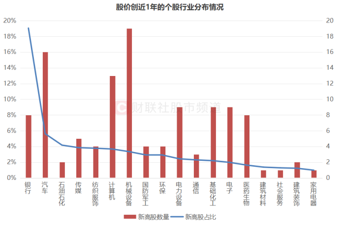 分行业(申万一级)来看,今日录得近1年新高的个股中,机械设备、汽车、计算机、电力设备、基础化工、电子股、银行、医药生物股数量较多。若从新高股在各自板块占比来看,银行板块“一骑绝尘”,新高股比例近19%,汽车、石油石化板块中新高股分别占比近5.6%、4.2%,此外,传媒、纺织服饰、计算机、机械设备、国防军工、环保等板块新高股占比较高。