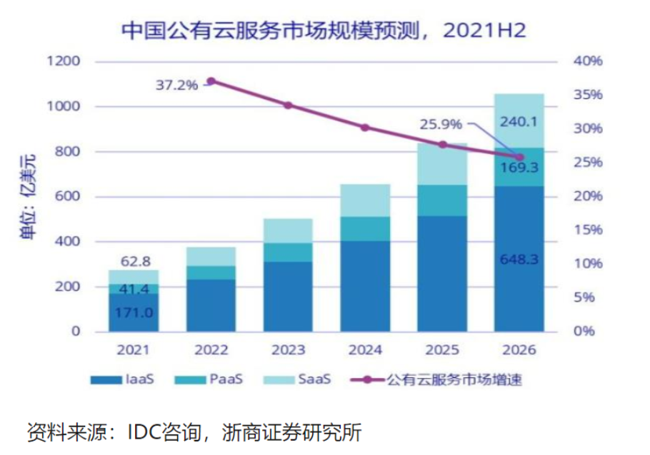 浙商证券张建民研报中表示,2022-2026,中国公有云市场会以复合增长率30.9%继续高速增长,预计到2026年,市场规模将达到1057.7亿美元。中泰证券陈宁玉等研报中预测,2025年中国移动和中国电信的云计算业务收入有望突破1000亿,中国联通云计算业务有望超过600亿。