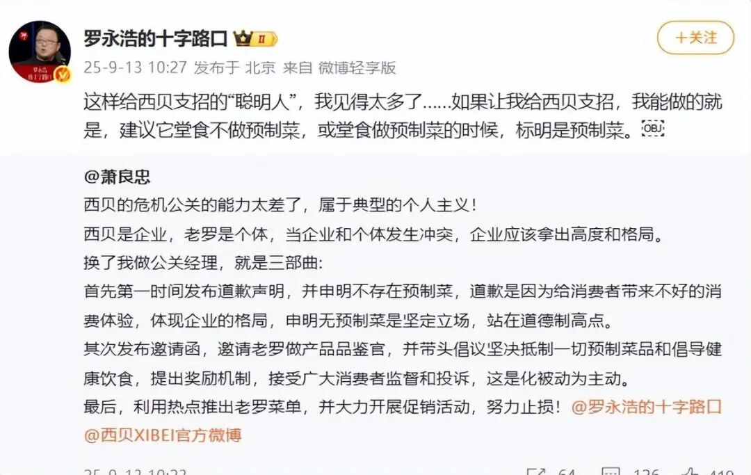 今天(9月13日),罗永浩最新博文称:堂食不做预制菜,或者标明是预制菜。