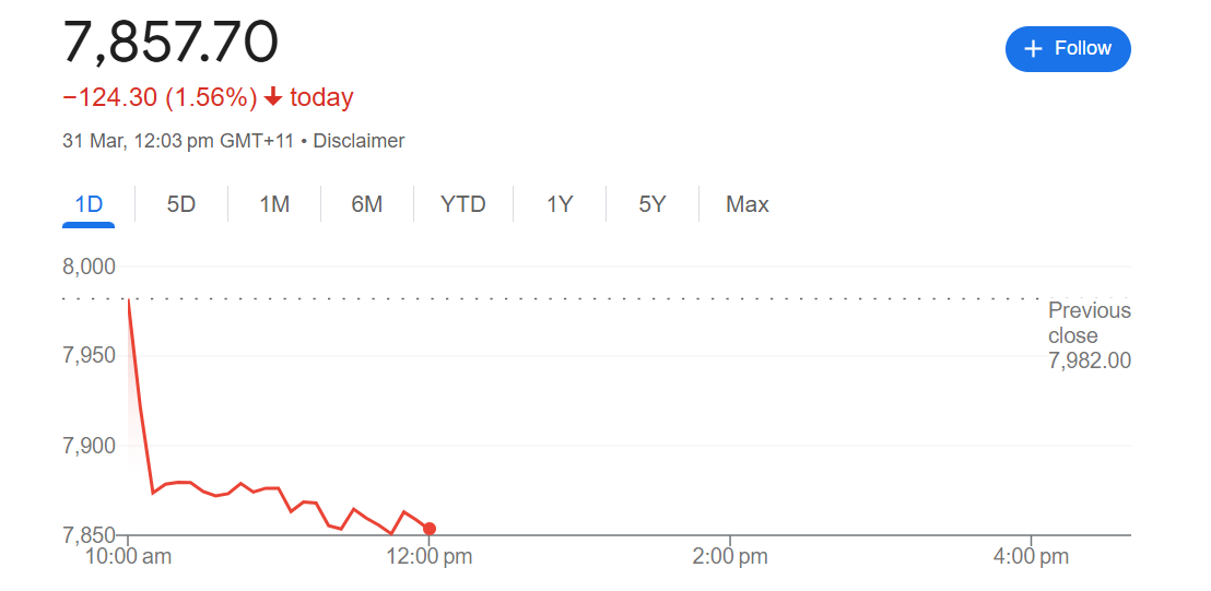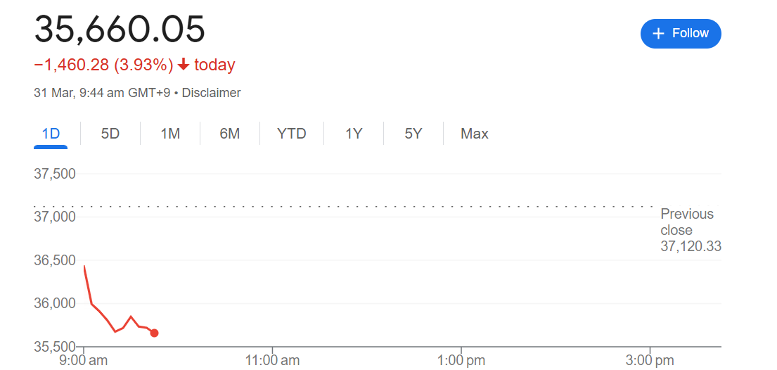 这是日经225指数自3月11日以来首次跌破36000点,能源、公用事业和医疗保健板块领跌。